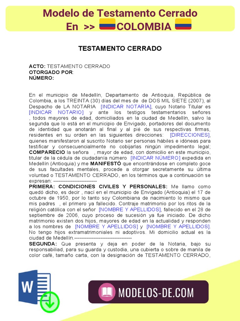 Consulte modelo de testamento y requisitos El ministerio de justicia sostiene que para hacer un testamento en colombia se debe realizar un documento y presentarlo ante una notaria que contenga lo siguiente: